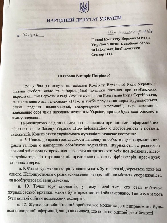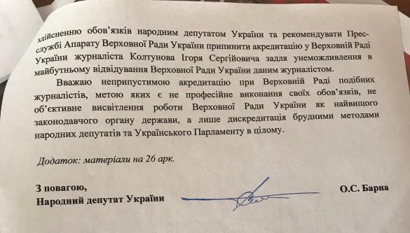 В частности, Олег Барна просит председателя комитета рекомендовать пресс-службе аппарата ВР прекратить аккредитацию  журналиста Игоря Колтунова "для предотвращения в будущем посещения Верховной Рады Украины этим журналистом". Барна считает, что журналист непрофессионально выполняет свои обязанности, а его целью якобы является дискредитация нардепов и парламента, а не освещение их работы.