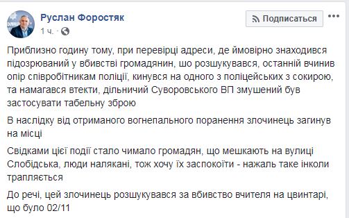 По его данным, утром, 8 ноября, во время проверки адреса, где предположительно находился подозреваемый в убийстве, мужчина оказал сопротивление сотрудникам полиции и бросился на одного из полицейских с топором. Подозреваемый пытался сбежать, сотрудник полиции открыл огонь, застрелив мужчину на месте. Форостяк отмечает, что застреленный мужчина подозревался в убийстве преподавателя одного из ВУЗов Одессы на местном кладбище.