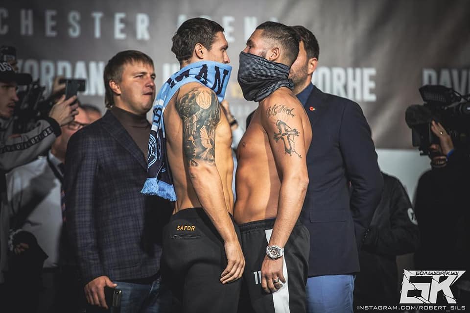 9 ноября взвешивание показало, что Александ Усик весит 89,81 кг, Тони Белью - 90,2 кг. После взвешивания соперники пожали друг другу руки. Белью на церемонии закрыл лицо банданой, Усик укутался в фанатский шарф "Манчестер Сити".