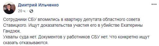 "Сотрудники СБУ вломились в квартиру депутата областного совета Ставицкого. Ищут доказательства участия его в убийстве Екатерины Гандзюк. Решения суда нет. Документов у работников СБУ нет. Что конкретно ищут сказать отказываются", - рассказал депутат.