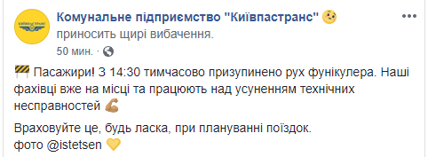 В Киеве, 11 ноября, временно остановили работу фуникулера. Об этом в Facebook сообщает КП "Киевпастранс".