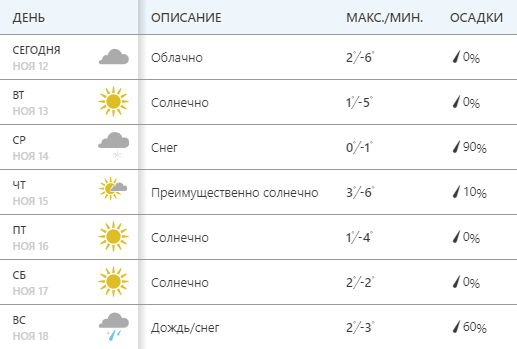 Сайт Weather.com обещает, пасмурный понедельник до +2 днем и -6 ночью. Во вторник выглянет солнце, днем воздух прогреется до +1, ночью - 5. А среду обещают снег, дневная температура 0, ночью -1. С четверга до воскресенья будет преимущественно солнечно, днем +1...+3, ночью -2...-6. В воскресенье дождь со снегом, днем +2, ночью -3.