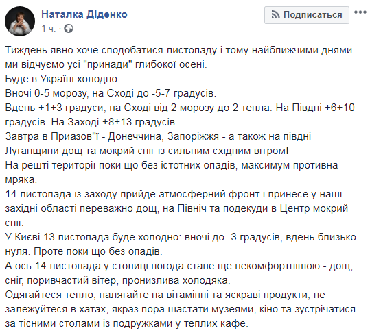 В Киеве 13 ноября будет холодно: ночью до -3 градусов, днем ​​около нуля. Однако пока без осадков. А 14 ноября погода в столице станет еще менее комфортной - дождь, снег, порывистый ветер, пронзительный холод.