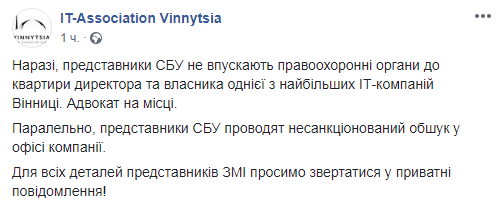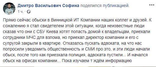 Глава Винницкой IT-ассоциации Дмитрий Софина на своей странице в Facebook отметил, что сам он стал свидетелем ситуации, когда неизвестные люди, представившись сотрудниками СБУ из Кива, вызвали сотрудников МЧС для взлома двери в квартиру Гнатовского. Также, по его словам, сбушники согласились впустить адвоката только после прибытия на место полиции. Пока что неизвестно, с чем связаны обыски и изымается ли техника и документы в офисе компании.