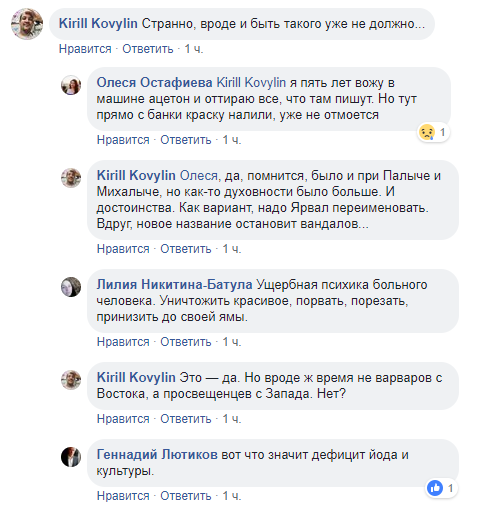 Пользователи в соцсетях возмущаются таким варварством. Они уверены, что "раньше духовности было больше". Другие иронизируют, что Ярославов Вал нужно переименовать: "Вдруг, новое название остановит вандалов".