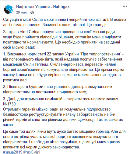 "Завтра в городе Смела планируется проведение сессии городского совета. Если будут приняты соответствующие решения, ситуацию можно решить положительно и нормализовать", - сообщили в "Нафтогазе".