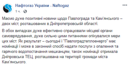 "Есть очень положительные новости по Павлограду и Каменском – двум городам, расположенным в Днепропетровской области. В обоих случаях очень эффективно сработали местные органы самоуправления, очень сильно этими вопросами занимались мэры этих городов. Как результат – сегодня и "Павлоградтеплоэнерго" имеет номинации и может законно предоставить услуги по отоплению и горячему водоснабжению жителям, также номинации получила Днепровская ТЭЦ, расположенная на территории громады города Каменского", - сообщает "Нафтогаз Украины" на странице в соцсети Facebооk в среду вечером.