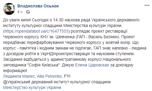 Сегодня, 15 ноября, научный совет Украинского государственного института культурного наследия Минкульта обсуждает проект реставрации Красного корпуса КНУ им. Шевченко. Об этом сообщила руководительница Центра культуры и искусств Киево-Могилянской академии Владислава Осьмак на своей странице в Facebook.