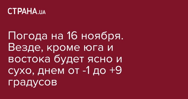 Сегодня, 16 ноября, на востоке и юге Украины ожидается снег с дождем, на остальной части страны без осадков, температура воздуха днем от -1 до +9 градусов. Об этом сообщает пресс-служба Укргидрометцентра.