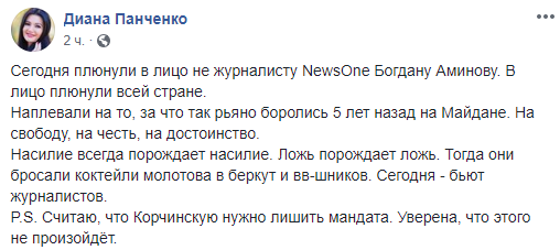 "Сегодня плюнули в лицо не журналисту NewsOne Богдану Аминову. В лицо плюнули всей стране. Наплевали на то, за что так рьяно боролись 5 лет назад на Майдане. На свободу, на честь, на достоинство. Насилие всегда порождает насилие. Ложь порождает ложь. Тогда они бросали коктейли молотова в беркут и вв-шников. Сегодня - бьют журналистов. P.S. Считаю, что Корчинскую нужно лишить мандата. Уверена, что этого не произойдёт", - написала телеведущая.