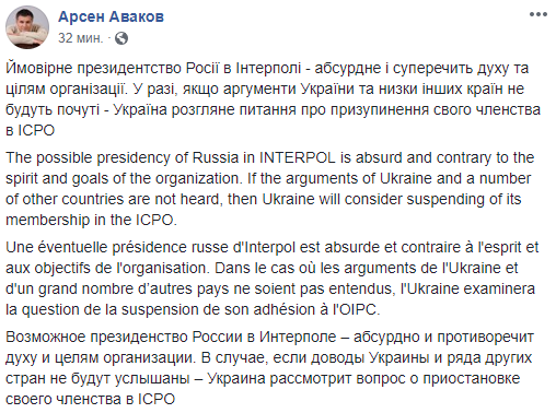"Возможное президенство России в Интерполе - абсурдно и противоречит духу и целям организации. В cлучае, если доводы Украины и ряда других стран не будут услышаны – Украина рассмотрит вопрос о приостановке своего членства в ICPO", - подчеркнул Аваков перед днем голосования, во время 87-й сессии Генеральной Ассамблеи Интерпола в Дубае.