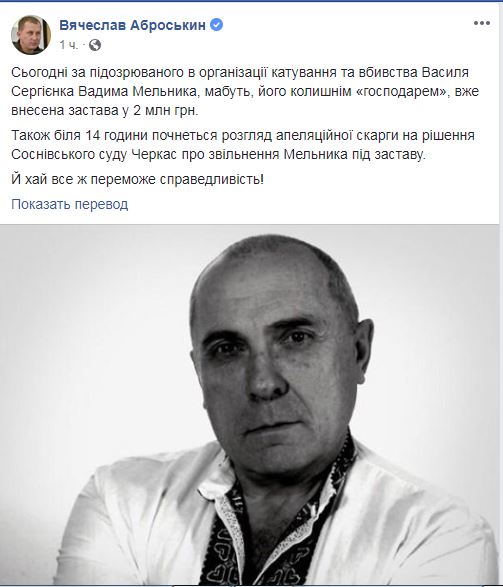 "Сегодня за подозреваемого в организации пыток и убийства Василия Сергиенко Вадима Мельника, по-видимому, его бывшим "хозяином", уже внесен залог в 2 млн грн", - отметил Аброськин. Он уточнил, что 20 ноября примерно в 14:00 должно начаться рассмотрение апелляционной жалобы на решение Сосновского суда Черкасс об освобождении Мельника под залог.