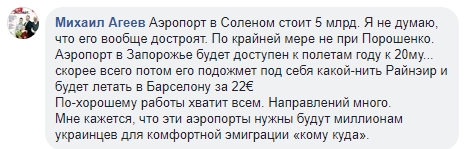 В комментариях говорят о том, что вряд ли аэропорт заработает: "Аэропорт в Соленом стоит 5 млрд. Я не думаю, что его вообще достроят. По крайней мере не при Порошенко. Аэропорт в Запорожье будет доступен к полетам году к 20му... скорее всего потом его подожмет под себя какой-нить Райнэир и будет летать в Барселону за 22€.