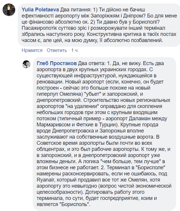 "Есть два аэропорта в двух крупных украинских городах. С существующей инфраструктурой, нуждающейся в реновации. Новый аэропорт (если, конечно, он будет построен - сейчас это больше похоже на новый гиперлуп Омеляна) "убьет" и запорожский, и днепропетровский. Строительство новых региональных аэропортов "на удалении" оправдано для скопления небольших городов при этом с крупным входящим потоком (типичный пример - аэропорт Даламан между Мармаривсом и Фетхие в Турции). Крупные города вроде Днепропетровска и Запорожья вполне заслуживают на собственные воздушные ворота. В Советское время аэропорты были почти во всех облцентрах, и это был рабочие аэропорты. К тому же, и в запорожский, и в днепропетровский аэропорт уже вложены деньги. А логика "чем больше, тем лучше" в этом бизнесе не работает".
