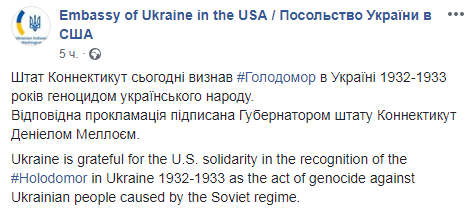 Сообщается, что 21 ноября штат Коннектикут признал Голодомор в Украине 1932-1933 годов геноцидом украинского народа, губернатор штатат Дэниэл Мэллой подписал соответствующую прокламацию. Ее пресс-служба посольства прилагает к публикации.