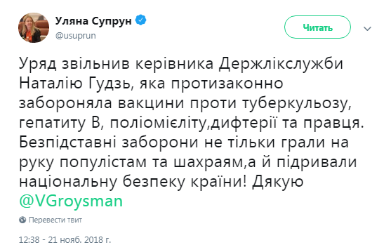 21 ноября правительство приняло решение об увольнении начальника Гослекслужбы Натальи Гудзь. Об этом написала и.о. главы Минздрава Ульяна Супрун в своем Twitter.