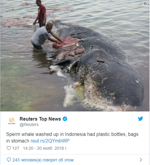 В Индонезии на берег выбросило мертвого кита, у которого в желудке обнаружили шесть килограммов пластика, в том числе 115 пластиковых стаканчиков и два шлепанца. Об этом сообщает агентство Associated Press.