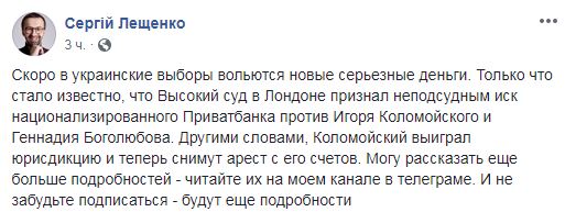 "Другими словами, Коломойский выиграл юрисдикцию, и теперь снимут арест с его счетов", - написал он. Лещенко добавил, что дополнительно сообщит детали.