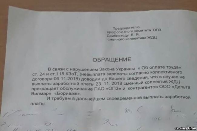 "В связи с нарушением трудового законодательства (невыплатой заработной платы, согласно коллективному договору 06.11.2018) доводим до вашего сведения, что в случае невыплаты заработной платы 23 ноября переменный коллектив железнодорожного цеха прекращает обслуживание "ОПЗ" и контрагентов "Дельта Вилмар" и "Бориваж".