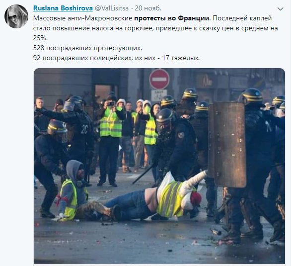 Напомним, 18 ноября, во Франции по всей страны вспыхнули протесты после резкого повышения цен на топливо, которое запланировано со следующего года.