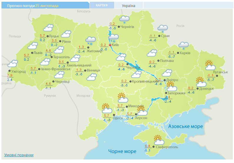В Киеве 25 ноября ночью без существенных осадков, днем ожидается мокрый снег. Днем температура воздуха от 0 до +2, ночью от -3 до -5. Ветер юго-западный, 5−10 м/с.