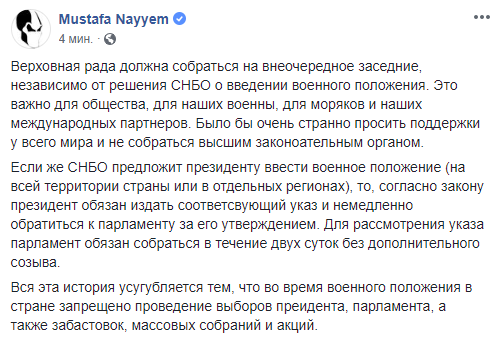 "Верховная Рада должна собраться на внеочередное заседание, независимо от решения СНБО о введении военного положения. Это важно для общества, для наших военных, для моряков и наших международных партнеров. Было бы очень странно просить поддержки у всего мира и не собраться высшим законодательным органом.