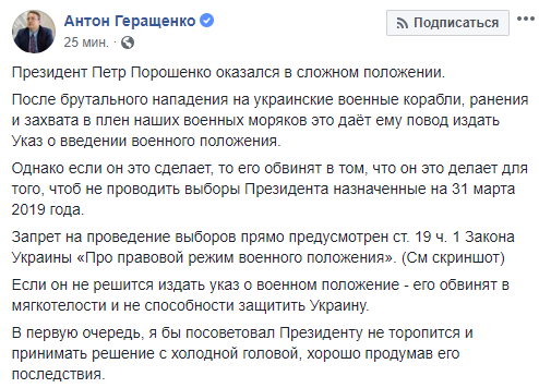 "После брутального нападения на украинские военные корабли, ранения и захвата в плен наших военных моряков это даёт ему повод издать Указ о введении военного положения. Однако если он это сделает, то его обвинят в том, что он это делает для того, чтоб не проводить выборы Президента назначенные на 31 марта 2019 года.