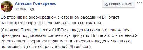Еще один нардеп от БПП Алексей Гончаренко заявил, что во вторник на внеочередном экстренном заседании ВР будет рассмотрен вопрос о введении военного положения.