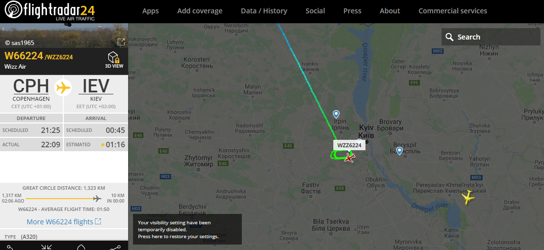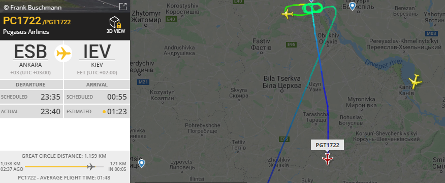Другой рейс, из Анкары в Киев, вероятно, развернули прочь от туманного Киева. Рейс PC1722 летит по направлению к Одессе. Посадка самолета, судя по данным flightradar24.com, задерживается на 2:14.