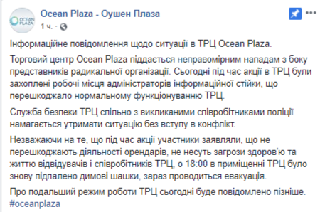 Вечером 28 ноября в ТРЦ Ocean Plaza начали эвакуировать всех посетителей из-за задымления внутри здания. Это уже не первый инцидент в торговом центре. Об этом сообщается на официальной странице торгового центра в Facebook.