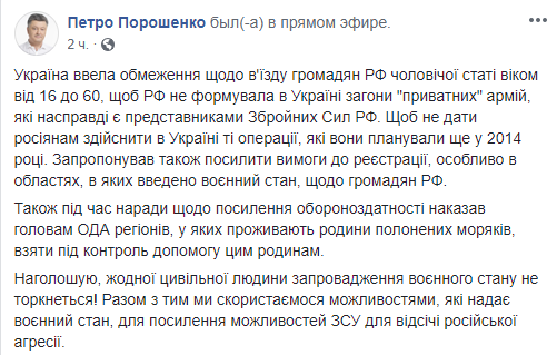 Президент Порошенко заявил, что Украина ввела ограничения въезда, чтобы Россия не формировала в Украине отряды "частных" армий, которые на самом деле являются представителями Вооруженных Сил РФ. А также, чтобы не дать россиянам осуществить в Украине операции, которые они планировали еще в 2014 году".