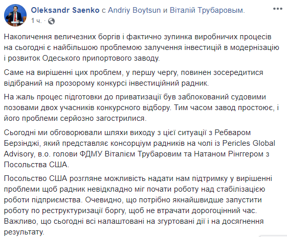 Посольство США рассмотрит возможность предоставить Украине поддержку в решении проблемы Одесского припортового завода, чтобы отобранный Фондом госимущества инвестиционный советник Pericles Global Advisory безотлагательно мог начать работу по стабилизации работы предприятия. Об этом сообщил министр Кабмина Александр Саенко на своей странице в Facebook.