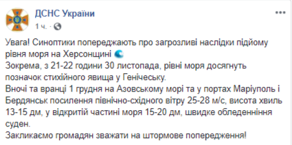 "Синоптики предупреждают об угрожающем последствии подъема уровня моря в Херсонской области", – говорится в сообщении на странице ведомства в Facebook в пятницу вечером.