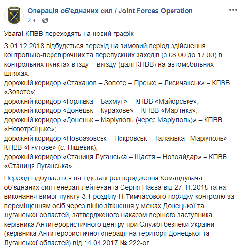 "С 1 декабря 2018 состоится переход на зимнее время осуществления контрольно-проверочных и пропускных мероприятий (с 08.00 до 17.00) в контрольных пунктах въезда – выезда", – говорится в сообщении на странице штаба в Facebook в пятницу.