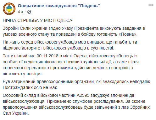 В Одессе в ночь на 1 декабря военный устроил стрельбу. Об этом в Facebook сообщает штаб оперативного командования "Юг".
