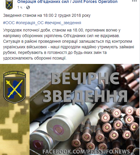 В воскресенье, 2 декабря, по состоянию на 18:00 на Донбассе не было зафиксировано ни одного обстрела за сутки после того, как все пункты пропуска перешли на зимний режим работы. Об этом сообщает пресс-центр операции Объединенных сил в Facebook.