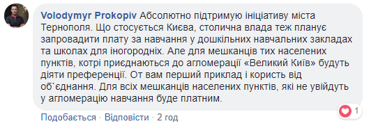 "Столичная власть тоже планирует ввести плату за обучение в дошкольных учебных заведениях и школах для иногородних. Но для жителей тех населенных пунктов, которые присоединятся к агломерации "Большой Киев", будут действовать преференции... Для всех жителей населенных пунктов, которые не войдут в агломерацию, обучение будет платным", - написал Прокопив.