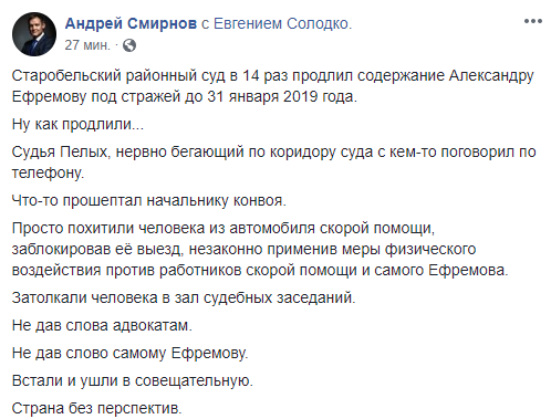 "Старобельский районный суд в 14 раз продлил содержание Александру Ефремову под стражей до 31 января 2019 года. Ну как продлили... Судья Пелых, нервно бегающий по коридору суда с кем-то поговорил по телефону. Что-то прошептал начальнику конвоя. Просто похитили человека из автомобиля скорой помощи, заблокировав её выезд, незаконно применив меры физического воздействия против работников скорой помощи и самого Ефремова. Затолкали человека в зал судебных заседаний. Не дав слова адвокатам. Не дав слово самому Ефремову. Встали и ушли в совещательную. Страна без перспектив", - написал адвокат.