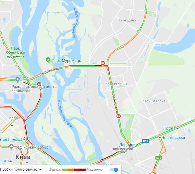 Тянучка образовалась на проспекте Победы. Здесь автомобили местами двигаются со скоростью 5-7 км/ч. Самым критическим участком проспекта Победы является промежуток между станциями метро "Святошин" и "Житомирская".