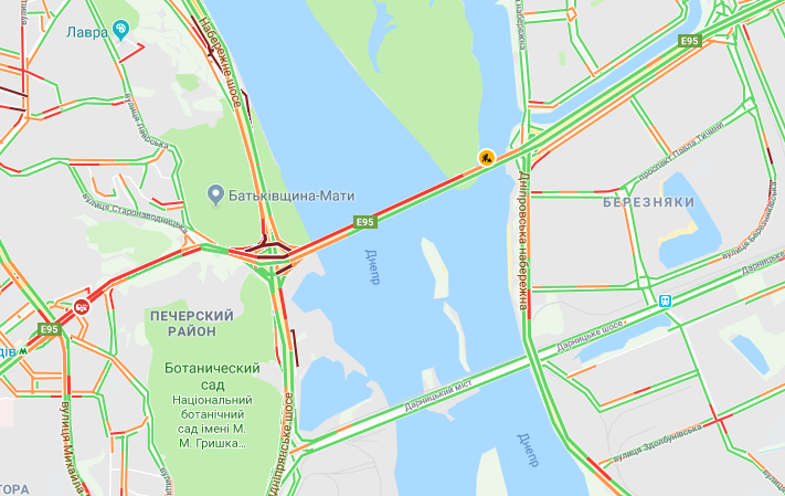 Также из-за ремонтных работ остановилось движение на мосту Патона. Автомобилям со скоростью около 10 км/ч удается двигаться по улице Набережно-Крещатицкая. Практически парализовано движение и по улице Елены Телиги.