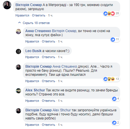 Также позже Сюмар опубликовала на своей странице в Facebook пост с приглашением журналистов в ТЦ за брошью, которая стоит "не больше 200 гривен" и обещанием "бороться с собой" и не потакать подделкам брендов.