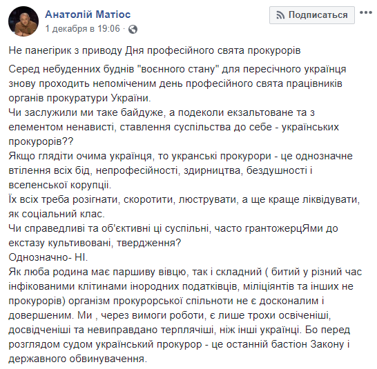 Вот опубликованный Матиосом пост от 1 декабря Фото: facebook.com/MatiosAnatolii