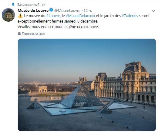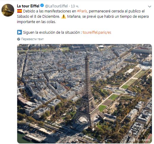 "Из-за запланированной на субботу, 8 декабря, очередной акции протеста "желтых жилетов" в Париже Эйфелева башня будет закрыта для посетителей в течение всего дня", - говорится в сообщении на странице башни в Twitter.