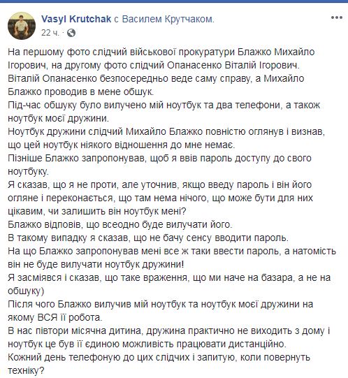 "Следователь Виталий Опанасенко понял, что у него ничего не получилось с Владимиром Петровым и Александром Барабошко, решил под видом возврата техники пригласить меня к ним в пятницу. Почему именно в пятницу? Для того, чтобы иметь возможность задержать меня и так следующие два дня суды не работают, держать меня до понедельника и "поработать" со мной", - написал журналист.