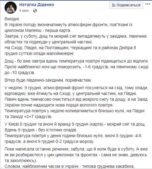 "Типичная декабрьская какабека". Синоптик рассказала о погоде в Украине на выходных