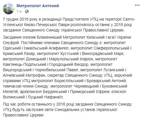 В Киеве сегодня, 7 декабря, началось заседание последнего в 2018 году Священного Синода УПЦ МП. Об этом сообщил митрополит Бориспольский и Броварский Антоний в Facebook.