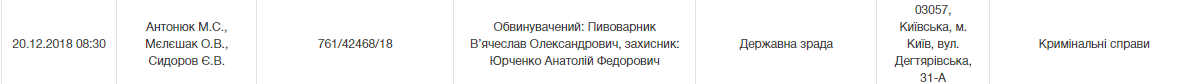 Указано, что Пивоварник вызывается на 8:30 20 декабря как подсудимый на подготовительное судебное заседание. Он обвиняется по ч. 1 ст. 111 (госизмена), ч. 1 ст. 14 ч.3,4 ст. 27 ч. 3 ст. 258 (подготовка терактов), ч. 2 ст. 258-5 (финансирование терроризма, ч. 3 ст. 27, ч.2 ст. 28 ч. 1 ст. 263 (незаконное обращение с оружием, боеприпасами и взрывчатыми веществами) Уголовного кодекса. Дело будет рассматривать судья Марина Антонюк.