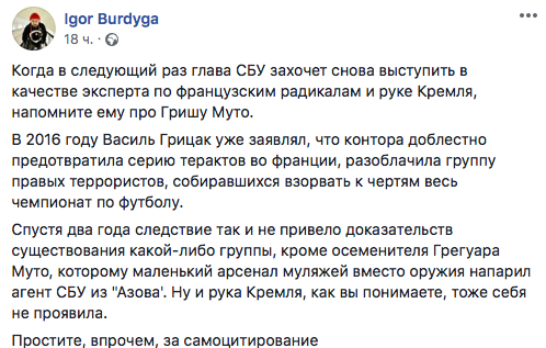 "Когда в следующий раз глава СБУ захочет снова выступить в качестве эксперта по французским радикалам и руке Кремля, напомните ему про Гришу Муто.