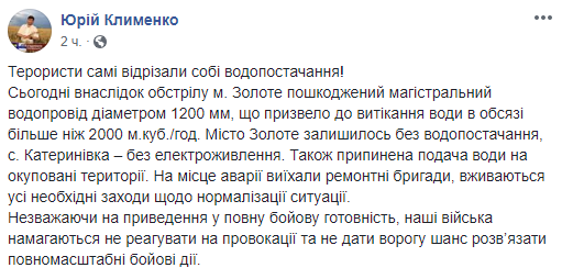 "Сегодня в результате обстрела в Золотом поврежден магистральный водопровод диаметром 1200 мм, что привело к вытеканию воды в объеме более чем 2000 м.куб./час. Город Золотое остался без водоснабжения, с. Катериновка - без электропитания", - написал он.