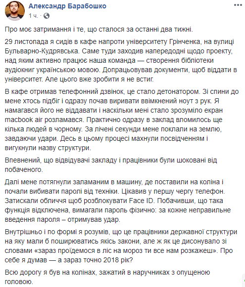 По словам Барабошко, его задерживали в кафе рядом с университетом им. Бориса Гринченко. "В заведение вломилось несколько человек в черном. За считанные секунды меня положили на землю, нанося удары. Где в этом процессе махнули удостоверением и воскликнули название структуры", - вспоминает Барабошко. В результате таких действий поломали MacBook Air, а после начали "выбивать" пароли от телефона.